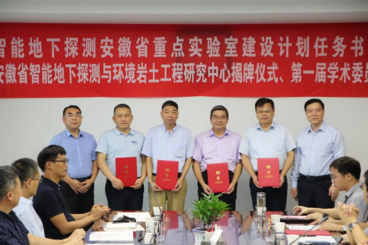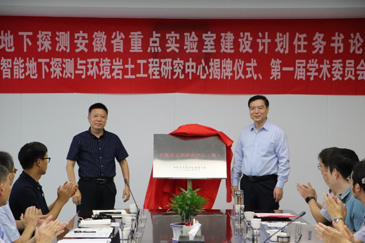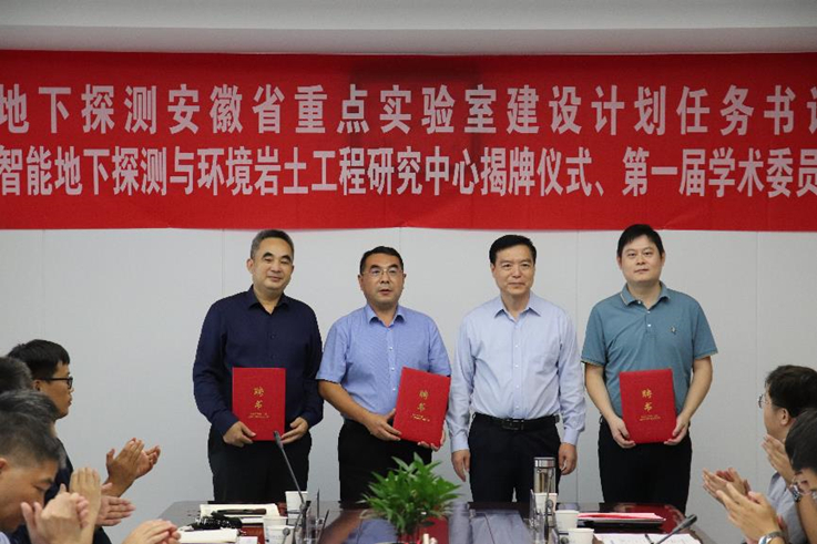 揭牌仪式上,黄显怀、宋长兵共同为中心揭牌,黄显怀为中心管理委员会委员颁发了聘书,蔡国军为学术委员会到场委员颁发了聘书,这标志着安徽省智能地下探测与环境岩土工程研究中心正式成立运行。