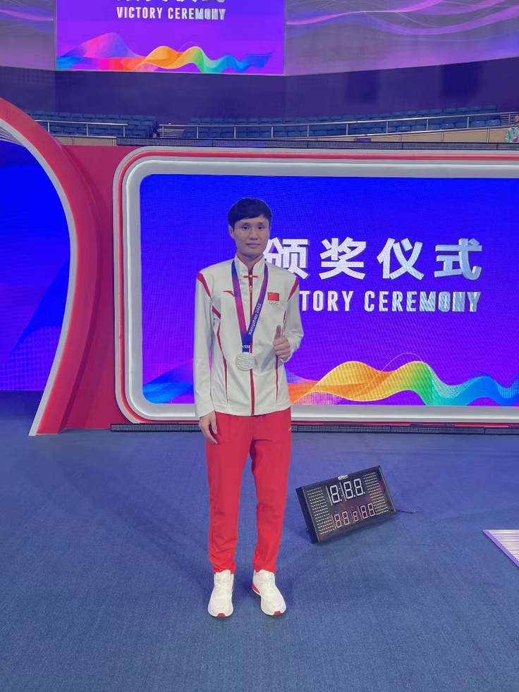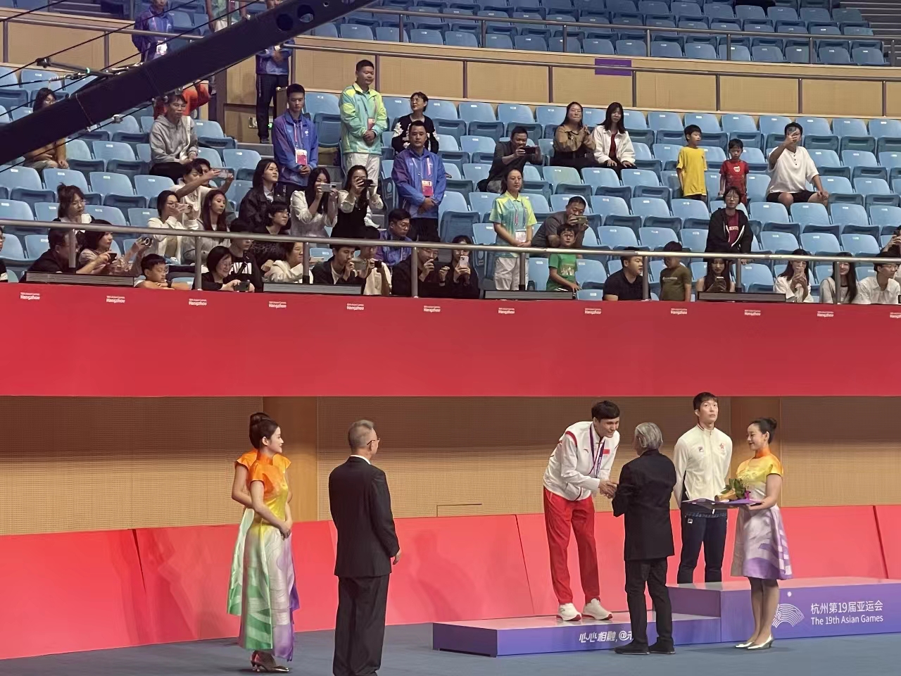 “于高山之巅,方见大河奔涌;于群峰之上,更觉长风浩荡。”亚运赛场上,强手如云,陈海威同学长剑轻挽,稳扎稳打、步步为营,淬炼出卓越超群的竞技水平,上演了一幕幕精彩的“剑锋”对决:四分之一决赛战胜中国台北选手陈弈,半决赛又力克中国香港选手蔡俊彦晋级决赛。决赛中,面对劲敌东京奥运会男子花剑个人冠军张家朗,陈海威顶住压力,仗剑拼杀,“剑气纵横三万里,一剑光寒十九州”,彰显了建大人的卓然风采,捍卫着祖国的光荣闪耀,奋勇拼下了男子花剑个人银牌。