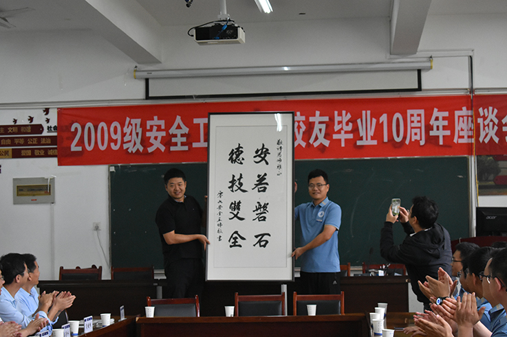 与会校友依次做了自我介绍,细数回忆了在母校的求学经历,感激母校的悉心培育;介绍了毕业后的工作和生活情况以及获得的成绩。感谢校友会、学院教师和筹备组同学的辛苦付出并向土木工程学院捐赠了书画《安若磐石,德技双全》。“安如磐石,德技双全”以“安”开头、以“全”结尾,善始善终。祝愿所有校友身体安如磐石,工作德技双全,安如磐石更是对母校蓬勃发展的美好祝愿。
