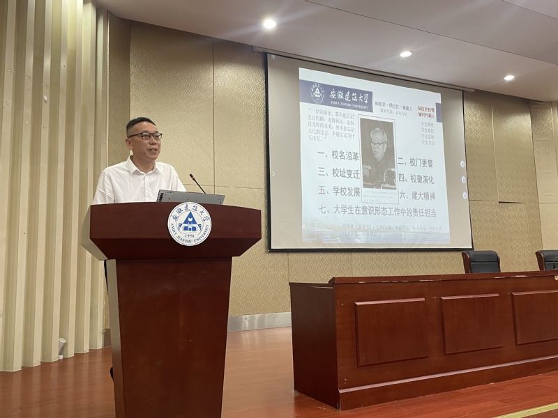 “安徽建筑工业学院的成立是全院师生员工的一件大事”,徐庚阳通过大量图片和文字,系统全面地介绍学校的办学历史、办学特色和发展成就,引导新生将爱校、荣校意识内化于心,激励新生明确自身责任使命,坚定理想,努力学习,争做新时代建大人。最后,徐庚阳结合思想政治教育要求和学生管理工作实践对新生们在意识形态工作中的责任担当提出“五线”要求:一是对标楷模,弘扬“主线”;二是力争优秀,看齐“高线”;三是确保良好,守牢“低线”;四是保底合格,警惕“灰线”;五是杜绝失责,不碰“红线”。
