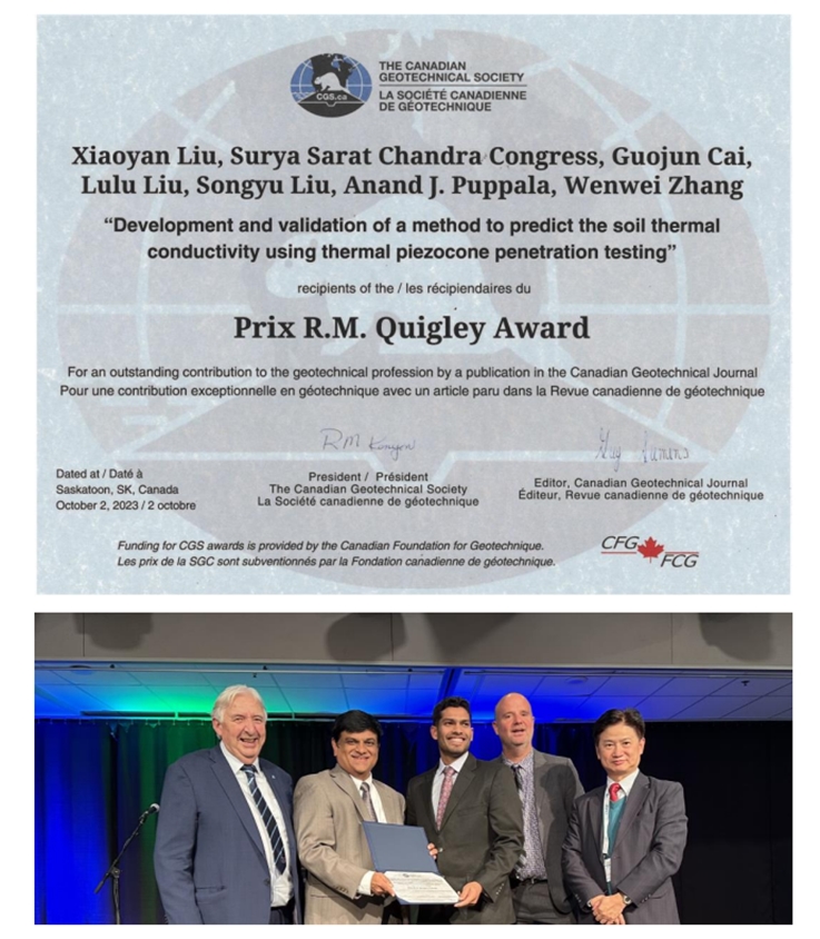本网讯 近日,ku游官方智能地下探测与工程地质原位测试团队发表论文“Development and validation of a method to predict the soil thermal conductivity using thermal piezocone penetration testing (T-CPTU) (doi:10.1139/cgj-2021-0034)”荣获2022年度《Canadian Geotechnical Journal》最佳论文奖,并被授予2023年“R.M.Quigley Award”。该论文第一作者为刘晓燕博士,通讯作者为蔡国军教授。2023年10月2日,论文共同作者德州农工大学Anand J. Puppala教授与密歇根州立大学Surya S. C. Congress助理教授参加了加拿大岩土工程学会年会GeoSaskatoon2023并接受颁奖。