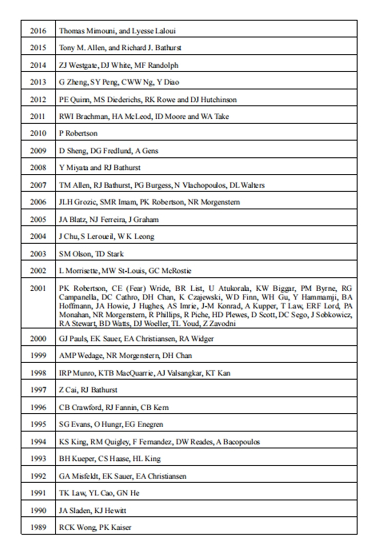 该奖设立于1973年,原名“加拿大岩土工程学会奖”,1995年更名为“R.M.Quigley Award”,以纪念R. M. Quigley博士(1934-1995)在岩土工程和地质环境领域做出的杰出贡献。该奖旨在表彰前一年度在《Canadian Geotechnical Journal》(国际三大权威岩土期刊之一)上发表的最佳论文(全球每年仅1篇)。(文/图:聂利青;审核:王媛)