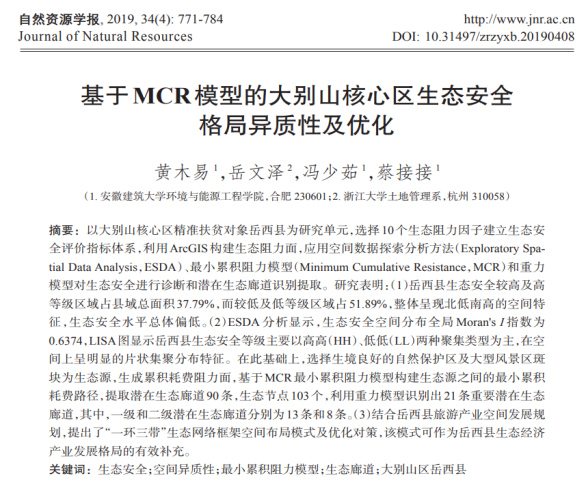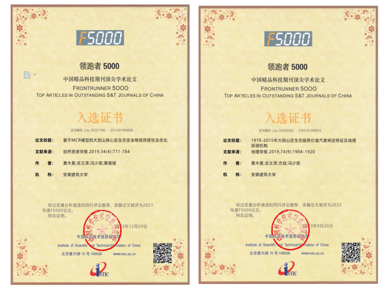 本网讯 ku游官方黄木易教授团队和南京师范大学方斌教授、浙江大学岳文泽教授合作发表在《自然资源学报》与《地理学报》上的论文,分别被中国科学技术信息研究所评为2021年度、2022年度“领跑者5000—中国精品科技期刊顶尖学术论文(F5000)”。其中,论文“基于MCR模型的大别山核心区生态安全格局异质性及优化”发表在2019年的《自然资源学报》(第34卷第4期)上,目前,据不完全统计该文下载量已达3500余次,引用率160余次;论文“1970-2015年大别山区生态服务价值尺度响应特征及地理探测机制”发表在2019年的《地理学报》(第2019年第74卷第9期)上,据不完全统计,论文下载量已达5000余次,引用率150余次。