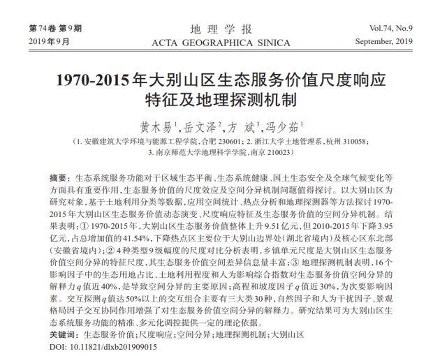 生态安全是国家安全的重要组成部分。党的二十大报告对生态文明建设作出了战略部署,明确了提升生态系统多样性、稳定性、持续性的战略任务和重大举措。因此,优化生态功能区的生态安全屏障体系,提升生态系统质量和稳定性是生态文明建设的重要实践。作为革命老区和重要生态功能区,当前大别山区的经济发展与生态环境保护矛盾日益突出,需要在巩固拓展脱贫攻坚成果的基础上,推动高质量乡村振兴和生态文明建设,因此,迫切需要加强生态系统功能优化,提高生态质量,提升居民福祉。目前,黄木易教授团队已在国内外权威期刊发表了一系列有关大别山区生态系统服务定量评估与时空演化机理机制、生态安全诊断及格局构建、居民福祉提升及生态系统功能调控等方向的高质量学术论文。本次入选的两篇F5000论文体现了我院在大别山区生态安全等相关领域取得了重要成果,该研究成果在国内具有较高影响力和学术价值。