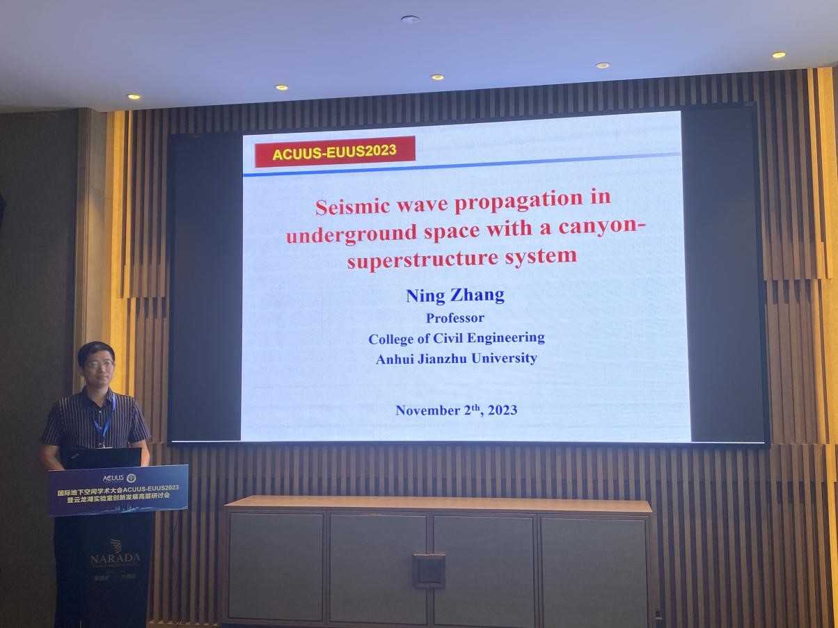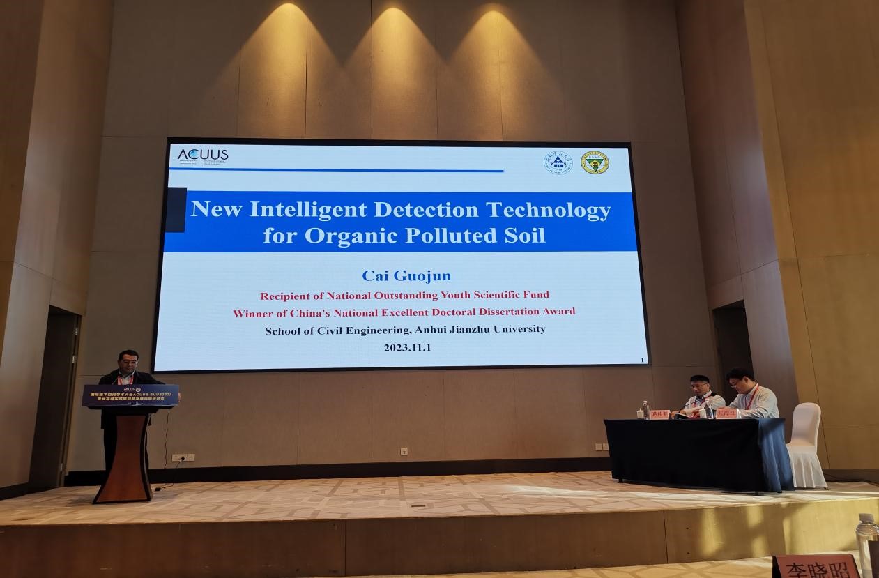 蔡国军教授在本次大会做“New Intelligent Detection Technology for Organic Polluted Soil”特邀报告,主要介绍了有机污染土智能探测新理论、新方法及新装备,相关工作得到了与会专家学者的高度评价,并与现场多位专家学者进行了深入的探讨和交流。张宁教授在本次大会做“Seismic wave propagation in underground space with a canyon-superstructure system”特邀报告,相关成果获得与会专家广泛关注。