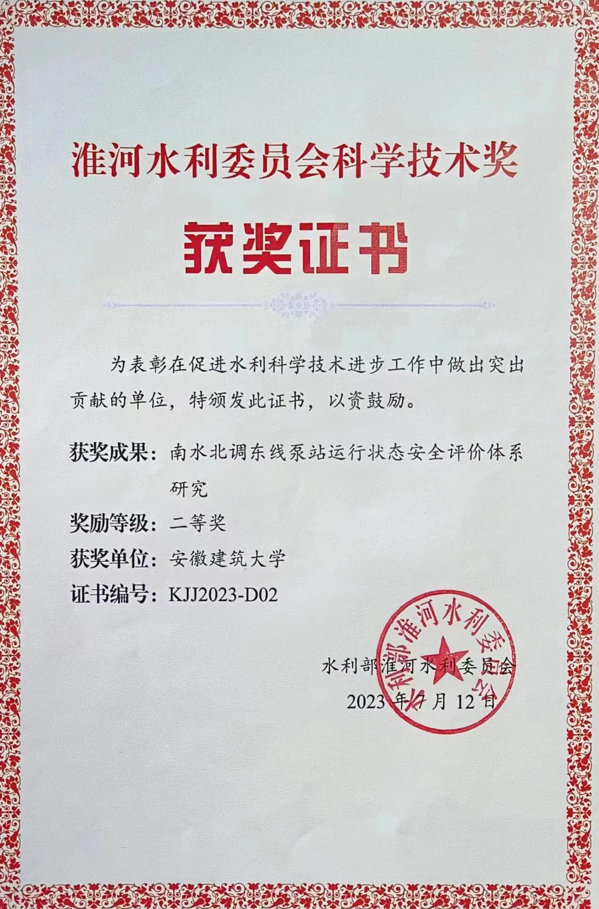 本网讯 近日,ku游官方土木工程学院教师余金煌申报的《南水北调东线泵站运行状态安全评价体系研究》荣获淮委科学技术奖二等奖。