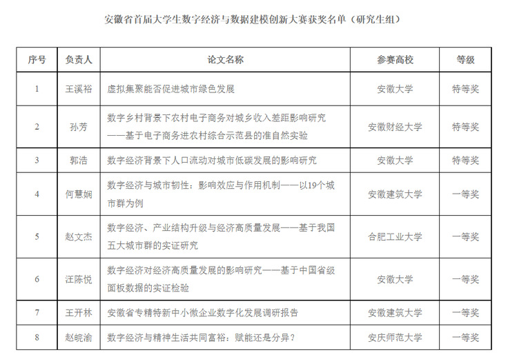 我校学子在本次大赛中取得佳绩,充分展现了学生的思维能力和创新能力,也体现了我校在人才培养方面取得的成果。下一步,学校将继续贯彻习近平总书记关于数字经济的重要指示,通过组织各类活动和加强教育,为学生搭建提高创新能力的平台,提升学生综合素质,助推安徽数字经济人才培养。(文/图:王梦卓 李娜娜;审核:彭志胜)