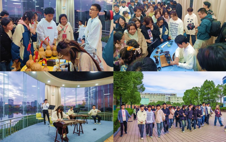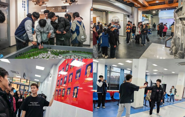 研学期间,来访师生先后参观了学校徽派建筑博物馆、体育馆、大学生活动中心、学生食堂等场所,实地观摩徽州古典建筑文物,了解学校徽派文化传承实绩。在击剑馆,同学们向高水平运动员学习击剑礼仪,在指导下尝试模拟对抗。由校团委和公管学院负责人引导,同学们观赏并亲身参与了学校小隐茶艺社茶艺表演、朝含国学社发簪现场制造和炽熠火笔画美育工作室非遗葫芦烙画示范教学。