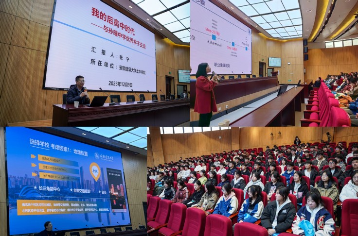 9日中午,教务处(招生办、创新创业学院)、校团委相关负责人在南校区徽弘门热烈欢迎由孙疃中学党总支副书记白宗杰带队的研学团一行,导览了日月广场建筑群风光,并在图书馆合影留念。随后,全体师生来到徽韵楼二楼报告厅参与系列讲座。教务处负责人介绍了学校基本情况,土木学院执行院长张宁教授以《我的后高中时代》为题,结合个人求学经历和我校土木学科发展历程,与同学们分享了如何确立专业兴趣的心得,并深入介绍了土木工程这一关系国计民生的重要学科的卓越贡献和发展潜力。就业工作处生涯规划专家、经管学院党委副书记帅英围绕高中生生涯规划建议,以《梦想,不止于大学》为主题,为在座学子进行了一次生动的职业生涯规划指导,鼓励大家认识自己,找准定位,努力实现人生梦想。教务处招生办工作人员阐述了学校建设发展成果和专业设置情况,就转专业、升学就业和食宿环境等学生感兴趣的话题作深入讲解。孙疃中学校友、我校2023级建筑学专业学生王佳佳与学弟学妹分享了在建大的学习生活感受。期间,来访师生与讲座专家进行积极互动,现场气氛热烈。