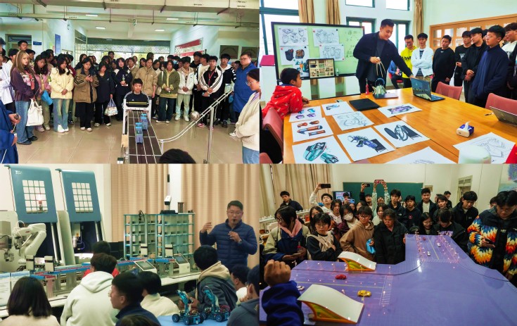 活动中,孙疃中学师生分组走访土木、建规、机电学院,各学院所属实验室全部开放,学院负责人亲自带领同学们参观了国家地方联合工程实验室、各省级重点实验室、学科竞赛基地和创新工作室,向学生展示了智能制造实验系统、3D打印、工业机器人运动控制表演、群控仿真演示、地下盾构实验系统、深海及地下智能探测装备等一系列高精尖科技,并指导学生亲身体验了机器人机械臂码垛等实验操作。精彩纷呈的先进科技设备演示让同学们大开眼界,学校丰富的教学和科研资源令师生深为折服。