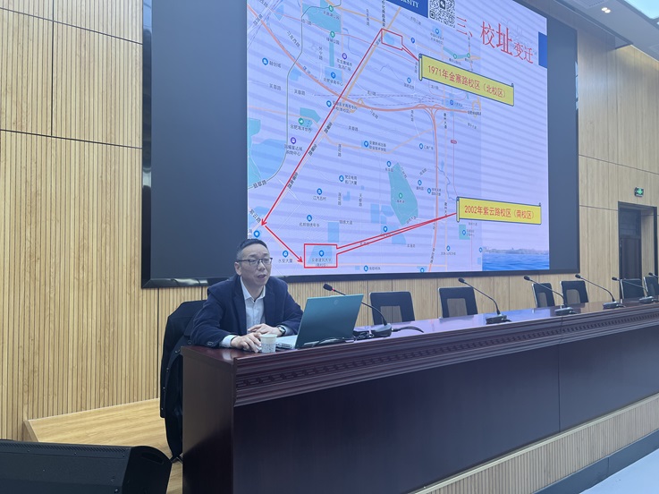 徐庚阳以《明校史校情,做时代新人》为主题,从校名沿革、校门更替、校址变迁、校徽演化、学校发展、建大精神、大学生在意识形态工作中的责任担当七个方面进行讲述。徐庚阳勉励同学们在今后的学习生活中,要践行学校的校训精神,立大志,明大德,成大才、担大任,让青春在实现中华民族伟大复兴的中国梦中绽放绚丽的绚丽之花。