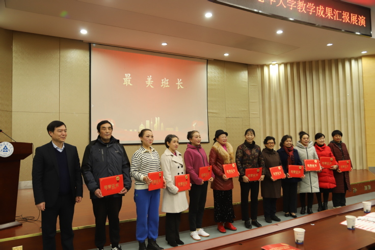 1月5日下午,由离退休处党委、离退休工作处和老年大学主办,学校老年大学以“舞劲快乐旋律 奏响新年乐章”为主题成功举办首次教学成果展演活动。民法班、剪纸班、茶与养生班、瑜伽班、声乐班、书法班、舞蹈班、太极拳班等9个班学员将一年所学汇聚精华,同台献艺,完成了一台别开生面的汇报演出。学员们积极参与、深情创作,节目形式新颖,亮点纷呈。