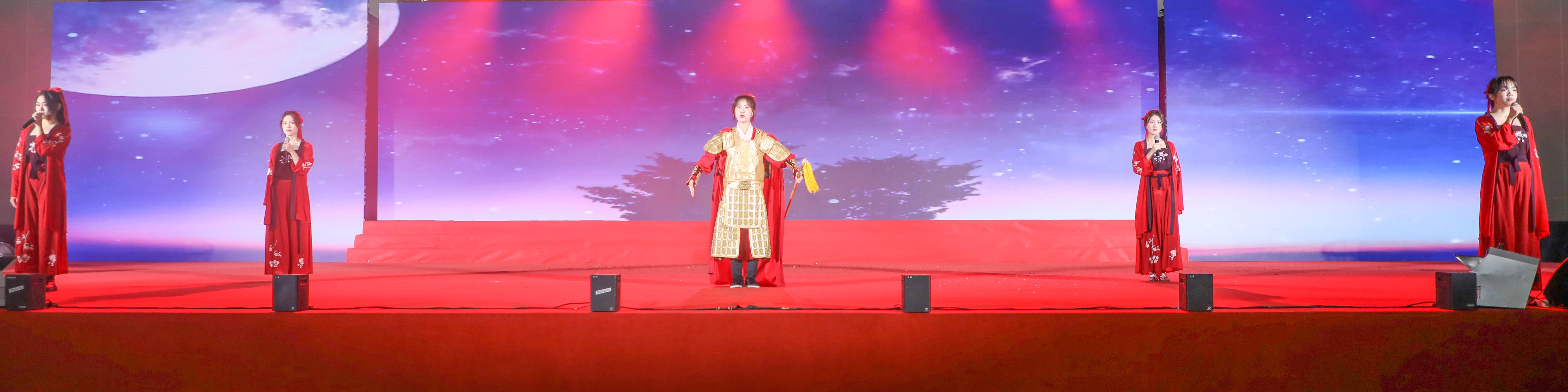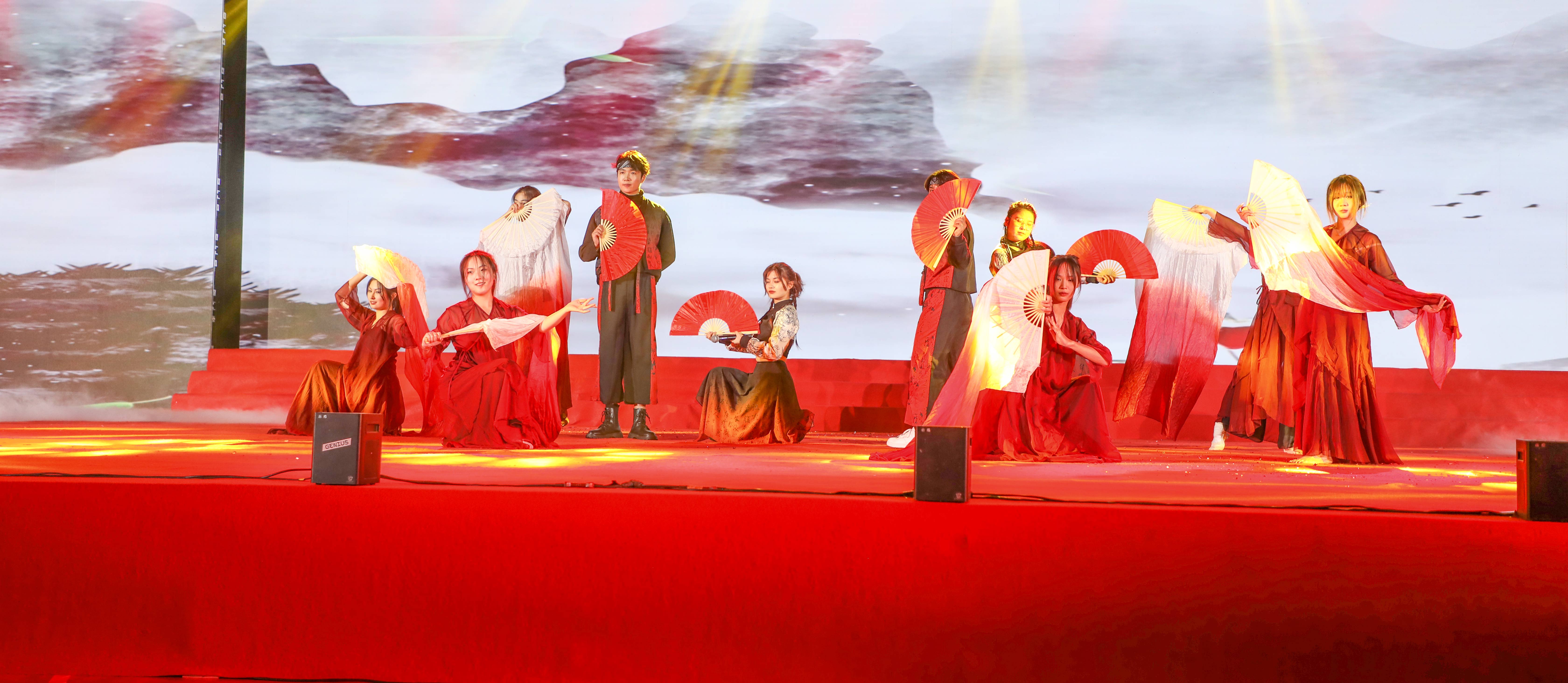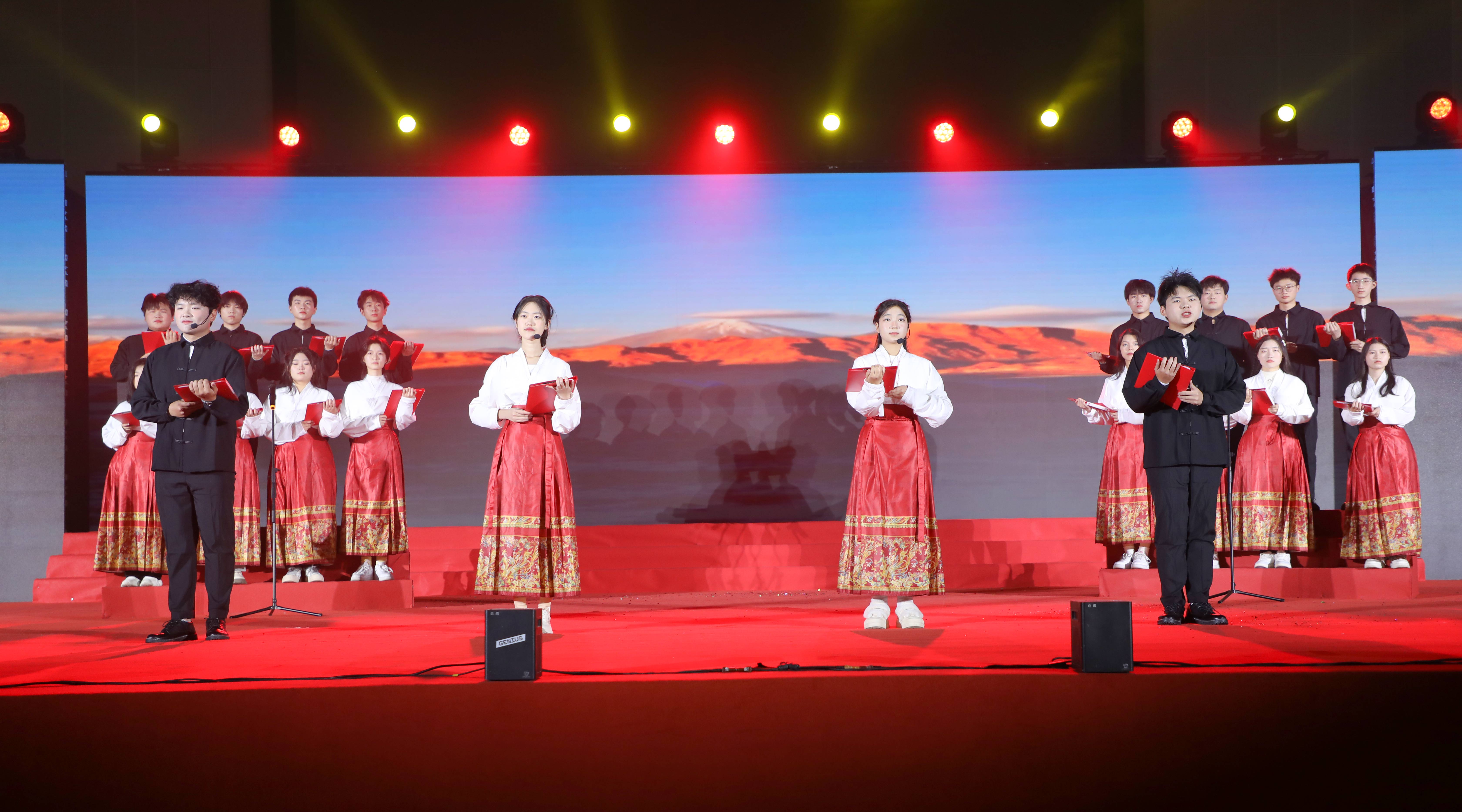此次展演活动在校公共艺术俱乐部《挺膺担当砺青春·踔厉奋发向未来》鼓舞表演中拉开帷幕。具有中国鼓和传统戏曲身段特点的鼓乐表演,气势磅礴,鼓舞人心,在激昂的音乐和激情的舞蹈中,展现出建大学子奋发向上、欢声笑语迎新春的欢快场面。活动由“追光·星火成炬”“踏浪·芳华正好”“奋进·筑梦同行”三个篇章组成,古典舞蹈《烟雨行舟》、情景朗诵《曲唱木兰勇,词诵家国情》、歌曲《最美的太阳》、现代舞蹈《一路生花》、合唱《仰望星空》……一个个精彩的展演作品由12个学院精心排演,艺术特色鲜明、表现形式多样、时代气息浓厚,把活动不断推向高潮。此次展演倡导向真、向善、向美、向上的校园文化氛围,建大学子用清澈坚毅的眼神展现着朝气蓬勃的力量,在跳跃的舞步中散发着“心中有信仰,眼里有光芒”的精神风貌。