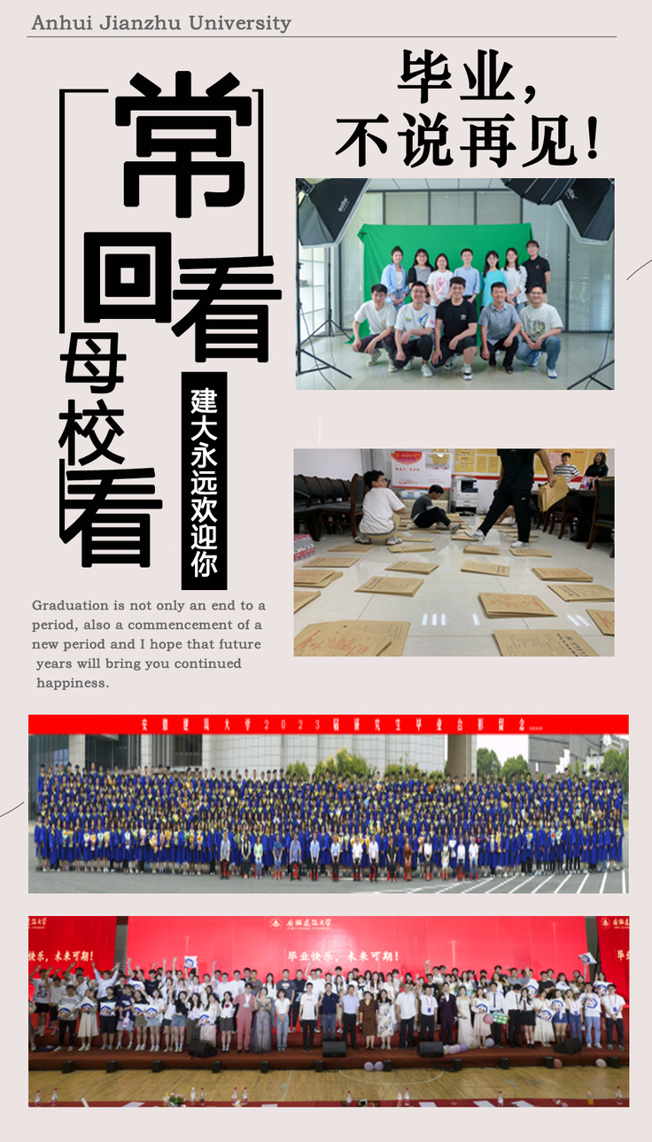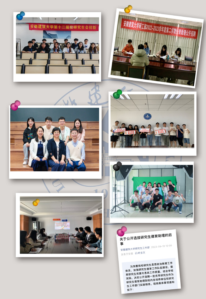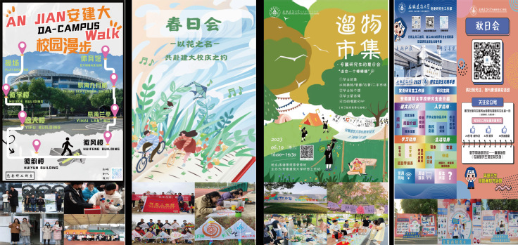 串好文化育人多彩绳。涵育文化之魂,培厚校园文化。本年度举办“弘扬传统文化,厚植爱国情怀”端午节主题活动暨2023研究生毕业欢送晚会,以65周年校庆为契机,推出“建大@你来写诗”“回溯校史续初心,薪火相传建大情,传承校史精神,校史知识竞赛”“遇‘建’有研,我与校友游建大”“妙笔生花,手绘建大”“一览‘研’风,研究生才艺大赛”等活动,培养研究生知校、爱校、荣校的深厚情感,在历史中汲取力量,在新时代新征途中砥砺前行。推动品牌树立,发挥文化育人。部门着力搭平台、育品牌、兴文化,以“研工时节”品牌,相继推出“春日会—以花之名,共赴建大65周年校庆之约”“夏日会—遛物(65)市集”“秋日会—亲爱的研究生,很高兴在建大遇见你”“冬日会—择一冬日暖阳,漫步建大校园”“晚安建大”“大研日记”等沉浸式文化体验活动。