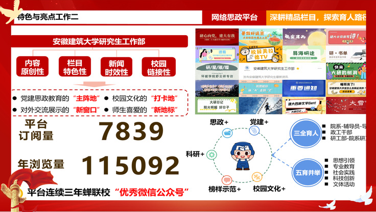 抓好思政教育关键点。把牢育人方向,提升育人实效。以学习贯彻习近平新时代中国特色社会主义思想主题教育为契机,持续推进“研思工作坊”建设,通过推送“党的二十大报告学习辅导百问”“金句学习”“建大红色巴士”等政治理论学习内容,强化研究生思想引领,引导研究生学习党史党情,鼓励将个人理想追求融入党和国家的事业之中。挖掘专业资源,凝练思政精品。依托建筑类高校的专业底蕴,实现专业思政同向同行,结合学校研究生思想政治教育工作实际,开展“学习宣传贯彻党的二十大精神”专题研究生精品思政项目建设工作,共4项课题立项。搭建实践课堂,强化学用结合。率先在新校史馆开展“校史馆里的微党课”,将理论学习和实践体验相结合,在师生互联互动中实现对研究生的思想引领、价值塑造和科学精神培育,通过党课宣讲、表彰先进、感悟交流等环节,将“科学理论”转化为研究生喜闻乐见的“生动故事”,实现读思结合、学用相长、知行合一。