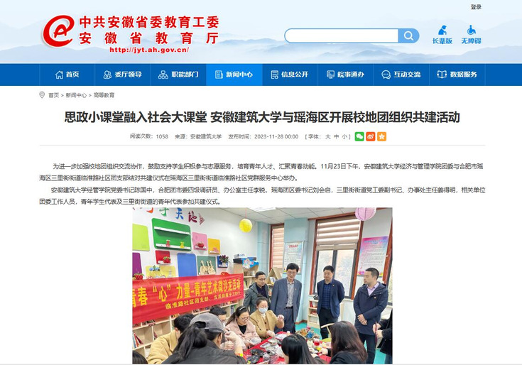 围绕雷锋月开展“知、信、行”系列主题活动,切实提高学生的创新意识和实践能力,鼓励学生将劳动实践能力内化为核心素养;开展“劳模进校园”、“身边的榜样展”等活动,进一步营造学习先进、崇尚劳动的良好氛围;组建“‘经心助梦’综合服务实践团”“‘下乡兴梦’菁琯创新创业实践团”分别前往六安市舒城县和芜湖市繁昌区开展捐赠物资、自建房问卷调查,调研乡村特色产业基地等社会实践活动,实践团获评2023年安徽省“三下乡”社会实践活动优秀实践团队;学院团委与合肥市瑶海区结对共建菁琯青年“第二课堂教育实践示范基地”,将思政小课堂融入社会大课堂,以上工作分别在安徽工人日报和安徽省教育厅官网宣传报道,形成良好的示范效应,充分诠释大学生积极参与社会实践的责任与担当。