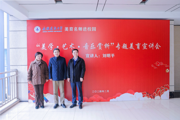 本网讯 为扎实推进新时代学校美育工作,2月28日,学校邀请安徽省政协常委、文化文史委副主任,研究员刘明平作《美学·艺术·音乐赏析》美育专题报告。校党委副书记、校长黄显怀、安徽省科技厅二级巡视员李静、安徽省招生考试院院长胡雨生、原安徽中澳科技职业学院党委书记汪源浩出席,校党委常委、副校长李早主持报告会。