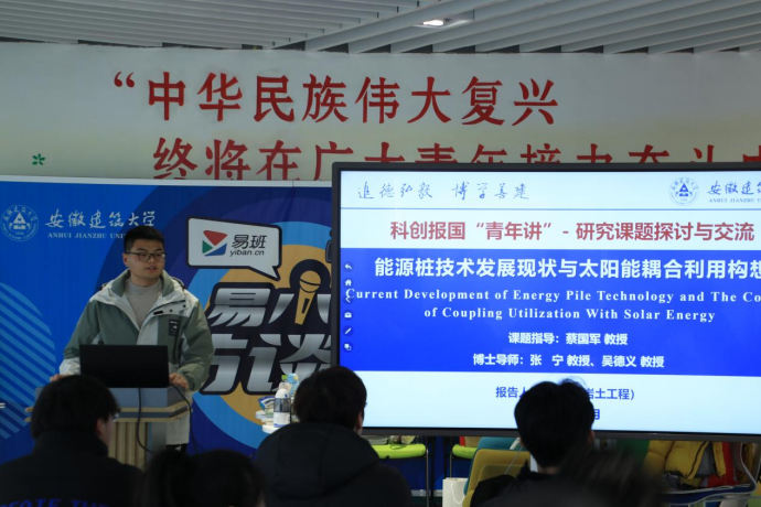 本次讲座以“能源桩技术发展现状与太阳能耦合利用构想”为主题,特别邀请到了土木工程学院23级岩土工程专业博士生方浩,与各学院研究生们共话科研生活及学术感悟。方浩从“能源桩技术”“发展与应用”“热响应测试”“新系统构想”四个方面深入浅出地讲解了能源桩领域前沿的科技知识和理论构想。他详细梳理了能源桩的发展历程,并结合多个工程实例,生动展现了能源桩在实际应用中的突出表现。最后,他深入剖析了热源模型、TRT测试方法以及不同类型的实验,为大家呈现了一个全面而深入的技术全景,并以前瞻性的视角,分析了当前新系统的发展趋势及研究热点与方向。整场讲座激发了在场听众的浓厚兴趣,更为未来的技术发展描绘了一幅充满希望的蓝图。