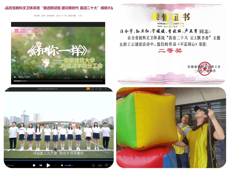 发掘个人所长,全面展示团体风采。在分工会活动组织过程中,鼓励广大教职工发掘、发挥自身兴趣爱好和特点特长,为展示集体风采贡献自己的力量。学院教职工自发组成视频拍摄团队,创作出“喜迎二十大”“学院招生宣传片”“校友风采”“经典诵读”等系列微视频作品,取得了诸多参赛成绩,也让教职工们的心灵境界得到了提升,爱岗敬业的热情得到了升华。