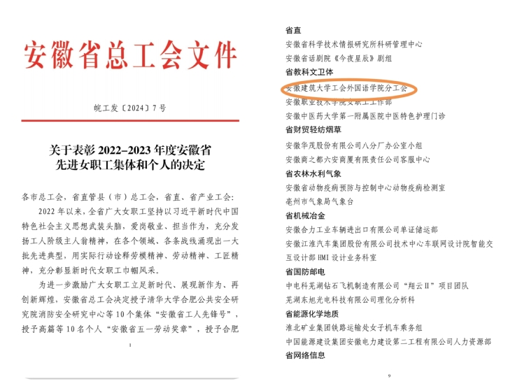 本网讯 近日,安徽省总工会公布了2022-2023年度安徽省先进女职工集体和个人表彰决定,ku游官方外国语学院分工会荣获“安徽省五一巾帼标兵岗”称号。