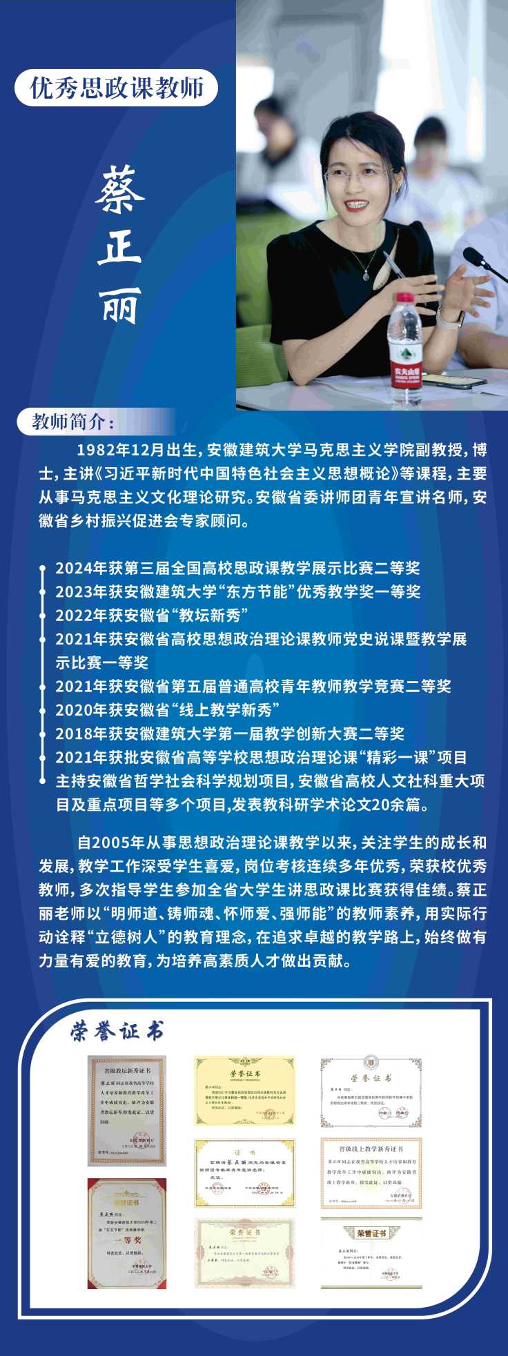 自2005年从事思想政治理论课教学以来,关注学生的成长和发展,教学工作深受学生喜爱,岗位考核连续多年优秀,荣获校优秀教师。多次指导学生参加全省大学生讲课比赛获得佳绩。蔡正丽老师以“明师道、铸师魂、怀师爱、强师能”的教师素养,用实际行动诠释“立德树人”的教育理念,在追求卓越的教学路上,始终做有力量有爱的教育,为培养高素质人才做出贡献。