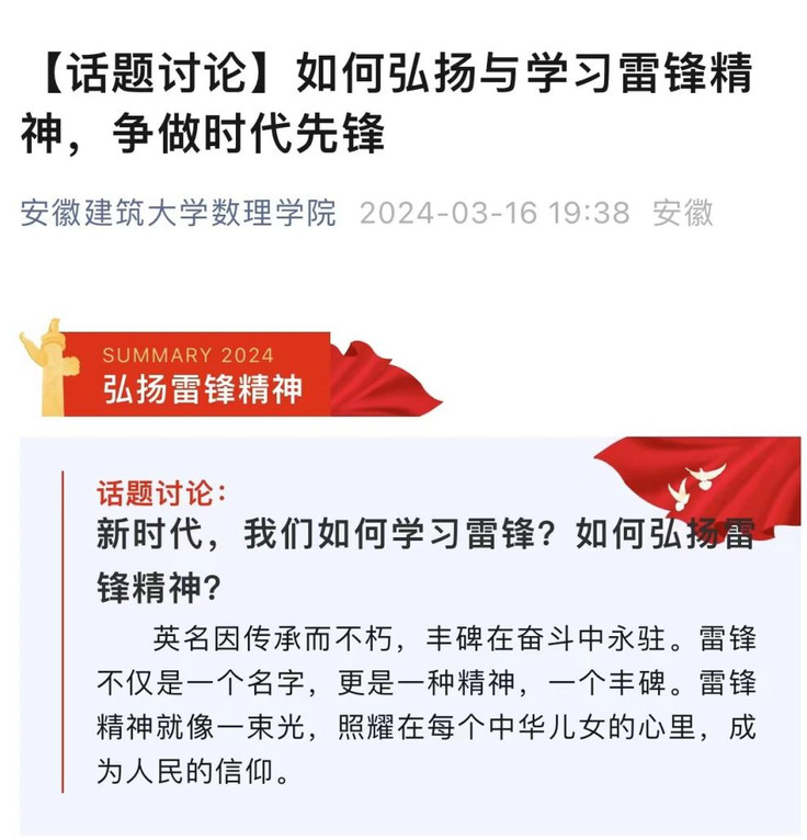 为进一步弘扬雷锋精神,深刻把握雷锋精神的时代内涵,数理学院新媒体中心在微信公众号上开展雷锋精神话题讨论活动。