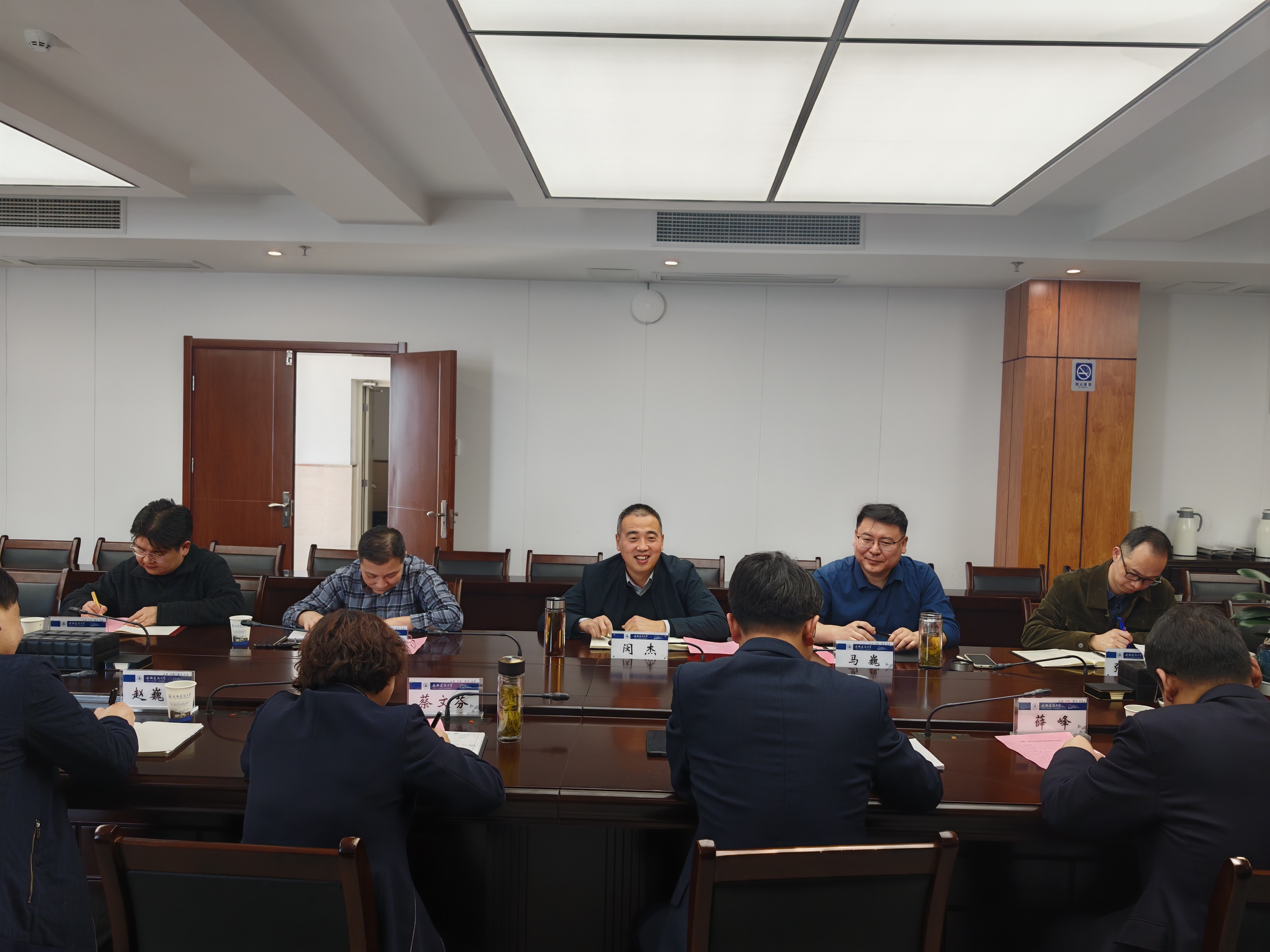 闵杰对操晓峰一行的到来表示热烈欢迎,并从学校审核评估开展总体情况、组织架构建设、迎评氛围营造,自评自建工作、线上评估和入校考察安排等方面针对性地介绍了学校新一轮审核评估工作开展情况,并就我校徽文化融贯人才培养全过程、“教学大检查”、“3个5%”学评教机制及优秀教学成果奖的设立等教学管理方面工作进行了详细解读。