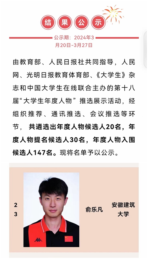 本网讯 近日,由教育部、人民日报社共同指导,人民网、光明日报教育体育部、《大学生》杂志和中国大学生在线联合主办的第十八届“大学生年度人物”推选名单公布,ku游官方公共管理学院2020级人力资源管理专业本科生俞乐凡荣获全国第十八届“大学生年度人物”提名奖。