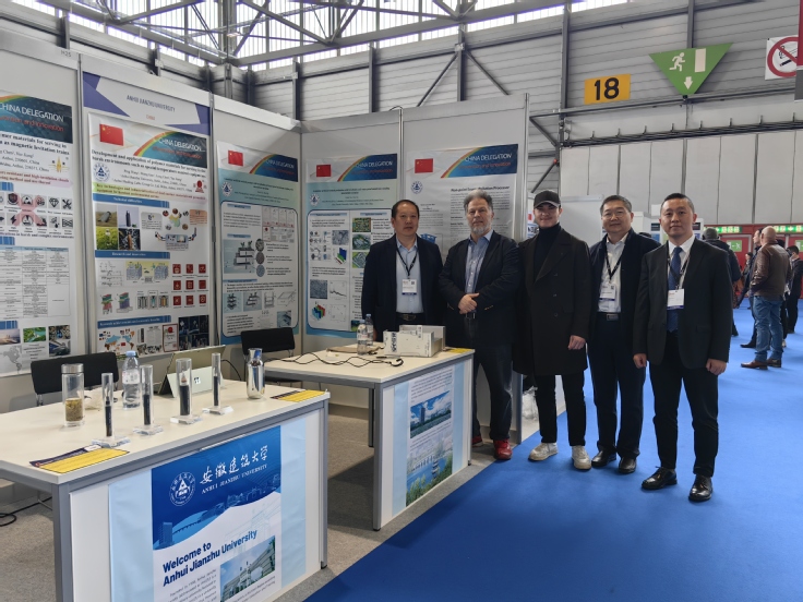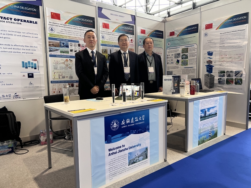谢发之团队获奖成果“一种可滑动组合、拆卸安装,可随时添加填料或对填料进行清洗再生的模块化人工湿地”,用于中小型污水处理厂尾水深度处理,助力污水厂提质增效。谢发之在展会现场与亚美尼亚展商进行了技术交流,达成了初步合作意向。