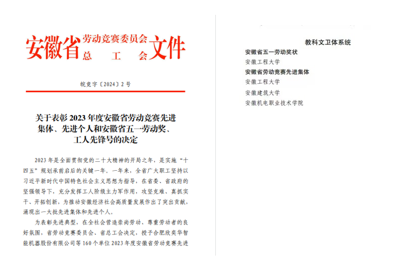 本网讯 近日,省劳动竞赛委员会、省总工会印发《关于表彰2023年度安徽省劳动竞赛先进集体、先进个人和安徽省五一劳动奖、工人先锋号的决定》(皖竞字〔2024〕2号),ku游官方喜获2023年度“安徽省劳动竞赛先进集体”荣誉称号。