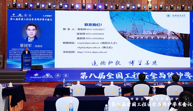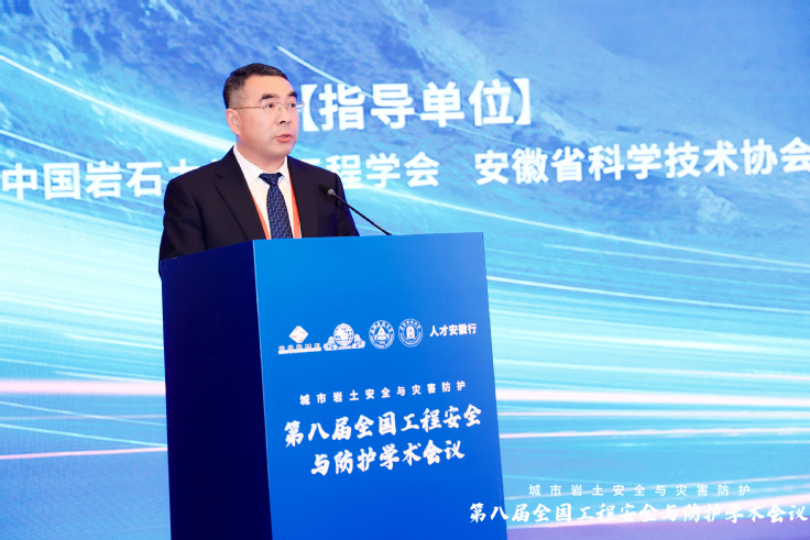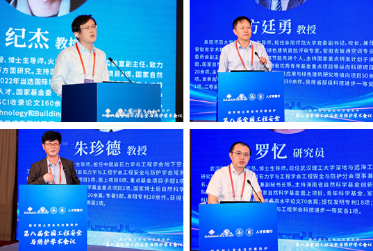 大会特邀报告环节由同济大学朱合华院士、北京建筑大学戚承志教授、南京大学施斌教授、南京理工大学何勇教授、中国科学技术大学纪杰教授、阜阳师范大学方廷勇教授、河海大学朱珍德教授和武汉大学罗忆研究员分别做题为:“智慧基础设施数字底座建设及其实践”“颗粒介质受载力链演化的力学模型”“岩土体灾变感知与应用”“新型爆炸毁伤与韧性防护技术”“隧道火灾烟气流动特性及控制方法”“城乡建设安全发展“安徽模式””“极端环境下干热岩体渗流网生成智能演化理论研究”与“复杂应力路径下双江口花岗岩破坏特征及能量演化机制”的大会报告。