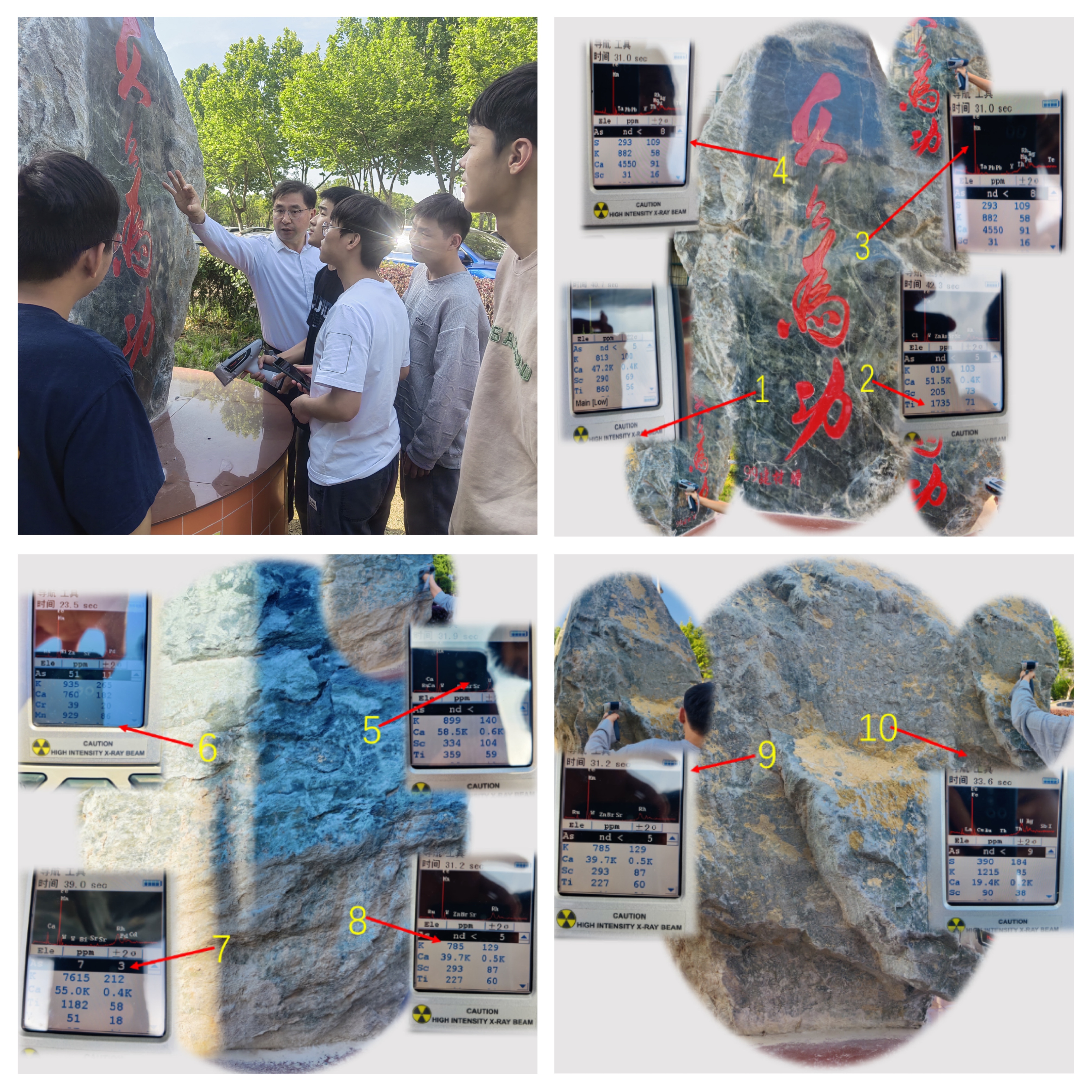 材检佳玉,体验劳动方法。1999级无机非专业校友在毕业二十周年返校时,于昆仑山与喜马拉雅山脉交会处,挑选了一块形似无机的硅氧四面体、近9.9吨的昆仑玉原石,捐赠给母校,感恩母校和老师的培养。玉石上撰刻“久久为功”,寓意毕业校友朴实无华、金玉其内、久久为功的内涵品质。5月8日,材化学院组织学生学习使用手持式元素分析仪,对这块珍贵的玉石进行无损检测,分析玉石所含元素成分。第一次接触到高端仪器,学生们十分新奇。在副院长张峰君的指导下,学生们积极参与、争相操作、认真记录,对玉石的正面、背面和侧面进行了定点检测,发现玉石中含有的金属元素多为Fe、Mn、Ca等。