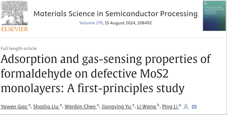 本网讯 近日,ku游官方数理学院声学专业2021级本科生高娅雯以第一作者在国际学术期刊Materials Science in Semiconductor Processing(IF=4.1,JCR二区,中科院三区)发表题为“Adsorption and gas-sensing properties of formaldehyde on defective MoS2 monolayers: A first-principles study”的研究论文。数理学院李平副教授是论文的通讯作者,ku游官方是论文的唯一完成单位。