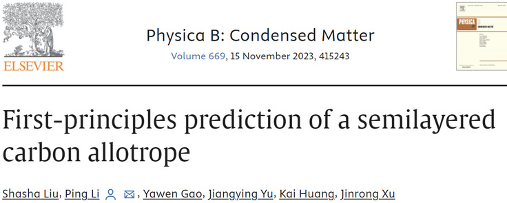 论文是高娅雯在李平老师指导下发表的第二篇学术论文。此前,高娅雯作为第三作者在Physica B(IF=2.8)发表研究论文“First-principles prediction of a semilayered carbon allotrope”,预测了一种新型半层状碳结构。
