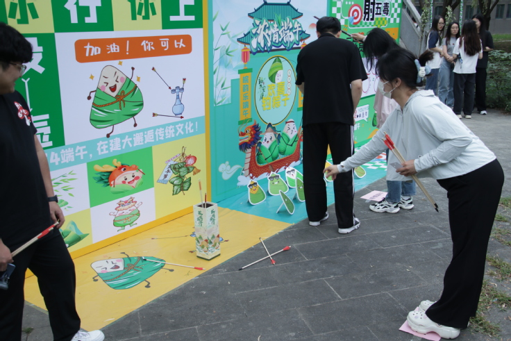 在优美的古筝乐曲中,大家重温传统习俗,感受传统文化,同学们握紧长箭,凝神静气,瞄准壶口,屏息片刻,然后猛地将箭投出。银箭划出一道优美的弧线,稳稳地落入壶中,围观的同学顿时欢呼雀跃。大家脸上露出笑容,接着走回队列,接受同伴的掌声和鼓励。游戏在紧张而愉快的氛围中进行。每当有人投中壶口,欢呼声和掌声便会此起彼伏;若是未中,大家也会报以鼓励的微笑和加油声。同学们在游戏中体验着端午的传统文化,感受着团结合作的乐趣。