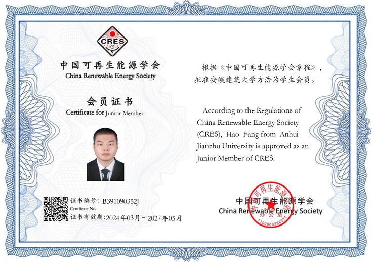 据悉,方浩同学是我校2014级本科生、2020级硕士研究生、2023级博士研究生(首届),在校期间已获各类荣誉及表彰60余项,现为中国可再生能源学会会员(学生)。