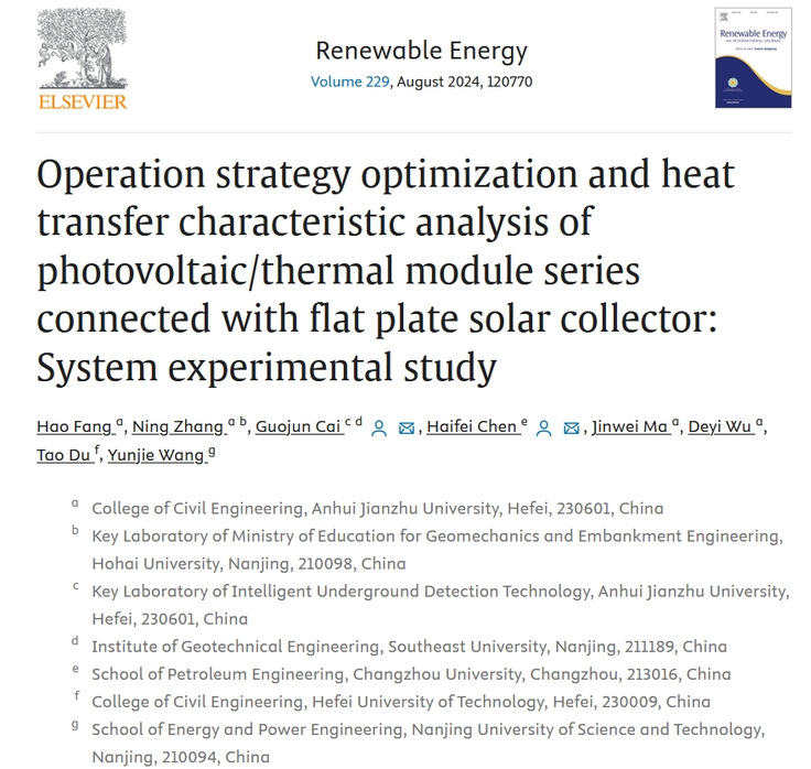 本网讯 近日,我校首届博士研究生方浩以第一作者身份在能源领域国际著名学术期刊《Renewable Energy》在线发表题为“Operation strategy optimization and heat transfer characteristic analysis of photovoltaic/thermal module series connected with flat plate solar collector: system experimental study”的研究论文。ku游官方为论文第一完成单位,蔡国军教授为论文通讯作者,论文获得国家杰出青年科学基金项目(42225206)的支持。论文共历经五轮严格的同行评议,在此过程中,张宁教授、马进伟副教授以及常州大学陈海飞副教授等给予悉心指导。