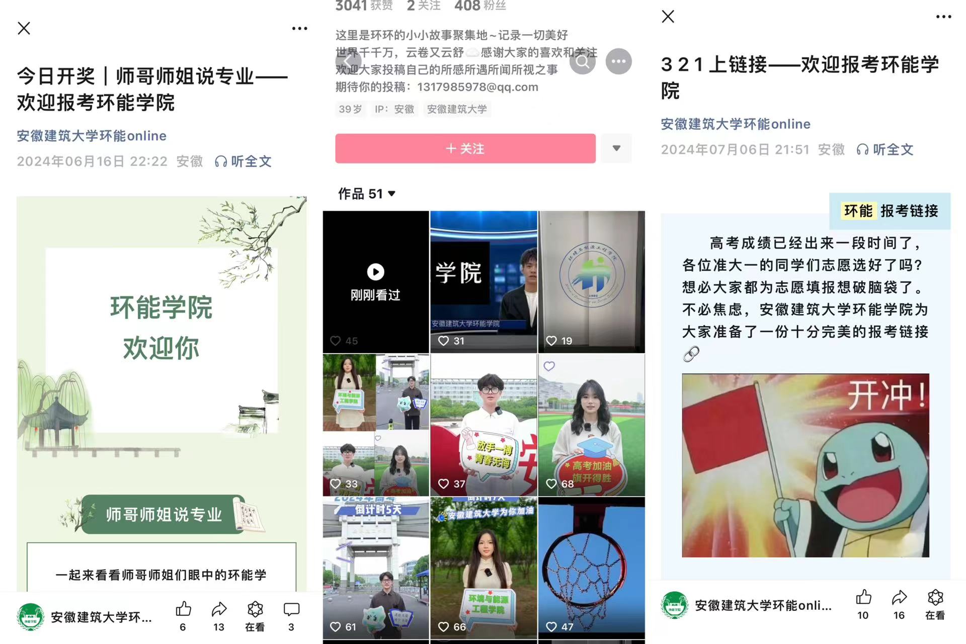 高考前后与志愿报考期间,学院充分发挥网络平台阵地优势,扩大招生传播力度,利用学院官方微信公众号“ku游官方环能online”与抖音“环宝的快乐日常”推送6篇推文、8条视频,在给高考生们加油打气的同时,也对学院专业进行了介绍,让考生及家长多视角地了解学校、学院。招生期间,开通电话专线、组建线上咨询群,提供丰富的线上咨询途经,全天候为广大考生和家长提供详尽的志愿填报参考咨询服务。多元媒体矩阵的构建,营造了良好的招生氛围,帮助广大考生和家长客观、全面地了解学校、学院及专业,切实有效地推动了招生宣传工作的稳步开展。