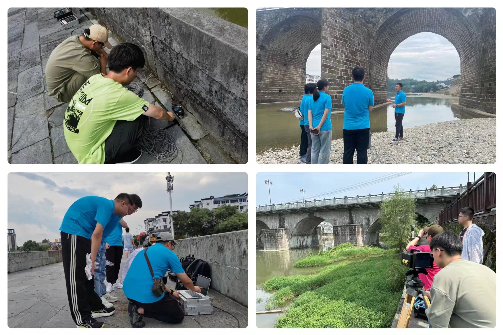 实地观测,记录古桥现状。在黄山连续遭遇百年一遇的暴雨洪水后,团队师生科学规划路线,逆溪而上,转山寻桥,触摸古桥的历史余温。团队在记录古桥风貌的同时,通过安全风险评估与现代科技手段,深入了解古桥所面临的问题。团队实地观测了太平桥、镇海桥、渔亭桥、紫阳桥等近三十座古桥,获取了徽州古桥的结构特点、规模以及所在环境等信息,收集了徽州遗产古桥在结构病害和安全风险方面的数据,为“轻量化”快速评估提供科学有效的实践数据。在指导老师专业讲解及引导式实践教学中,团队总结了遗产古桥保护所面临的一系列问题,初步调研发现当下古桥灾变事件主要存在的三方面客观原因:环境观测零碎、水系径流演化、结构性能退化。针对这些问题,团队结合专业学科优势提出了古桥保护新建议和新途径,为徽州古桥的保护与可持续发展贡献青春智慧。