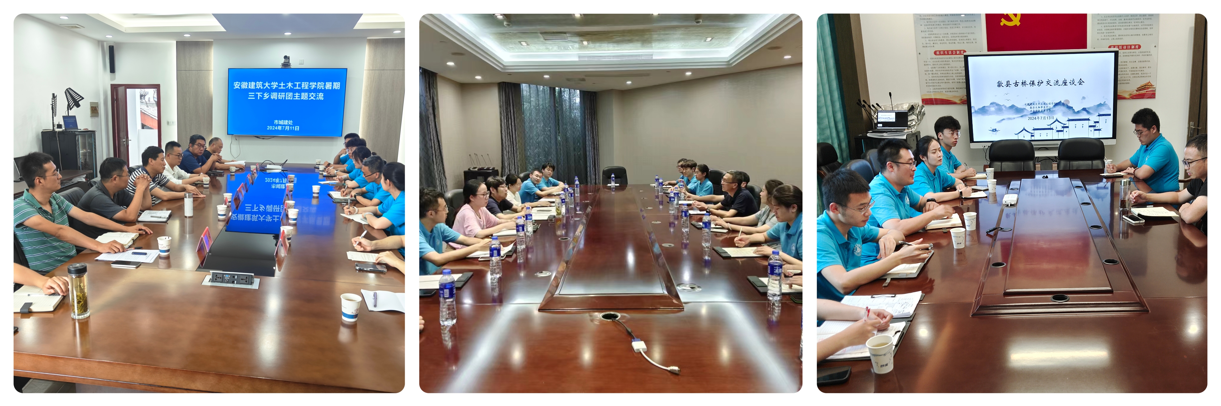 访谈座谈,探索保护新路。为进一步探索古桥保护新思路,探讨徽州古桥保护工作的现状及未来发展方向,团队与黄山市城建设计院院长陈继腾、黄山市住建局城建处处长宋鹏翀、歙县文物中心副主任周虎等进行交流。陈继腾在访谈中指出:“文化遗产是民族的记忆,也是黄山地区发展的重要资源。我们需要从技术和理念两个层面来共同推动文化遗产的保护与传承。”宋鹏翀在座谈中详细介绍了住建部门在桥梁日常养护和维修方面所做工作,展示了桥梁主管部门科学管理的积极举措。周虎就近年徽州地区出现的桥梁受灾数据道明徽州古桥现状不容乐观,从结构、化学和生物三方面分析古桥安全风险因素。团队指导老师分享了如何结合现代科技手段与传统技艺的新颖见解,例如,利用数字化建模新方法进行文化遗产的精确记录和再现,现代化监测新技术预警古桥安全状态,这不仅有助于古桥的结构性保护,也能维护古桥原有的历史风貌。