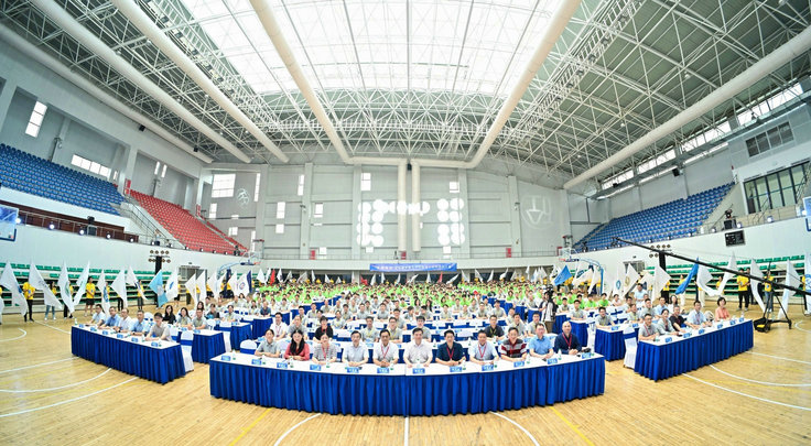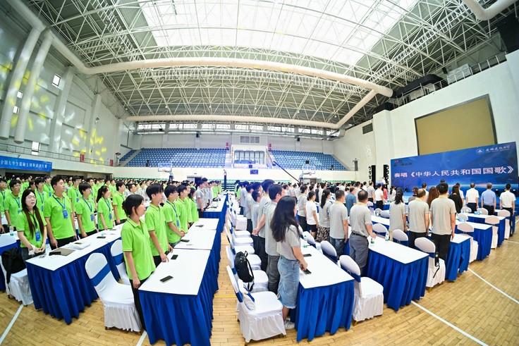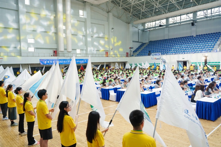 随后,进行了震撼全场的校旗入场仪式。整齐着装的67名志愿者,挥舞着67面高校校旗奔跑入场,风采奕奕。现场旗帜飘扬,令人振奋,为本次大赛积极向上、拼搏昂扬的精神写下浓重一笔。