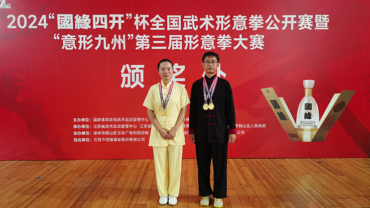 本网讯 近日,2024年全国武术形意拳公开赛暨“意形九州”第三届形意拳大赛在江苏省徐州市举行,我校教工武术协会杜卫提和李晓冉两名老师不畏强手,沉着应战,勇夺4枚金牌。
