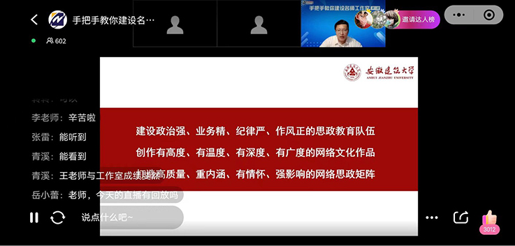 本次公益直播邀请到辽宁省网络名师工作室、辅导员名师工作室主持人辽宁生态职业学院刘明耀,安徽省高校网络教育名师培育支持计划项目、“E起成长”工作室主持人巢湖学院苏洁红,安徽省弘扬社会主义核心价值观名师工作室“逗,留工作室”、安徽省高校网络教育名师培育支持计划项目主持人ku游官方王昊禾参加分享,吸引了来自全国各地860余名辅导员参加直播。