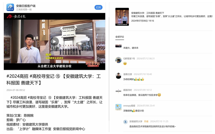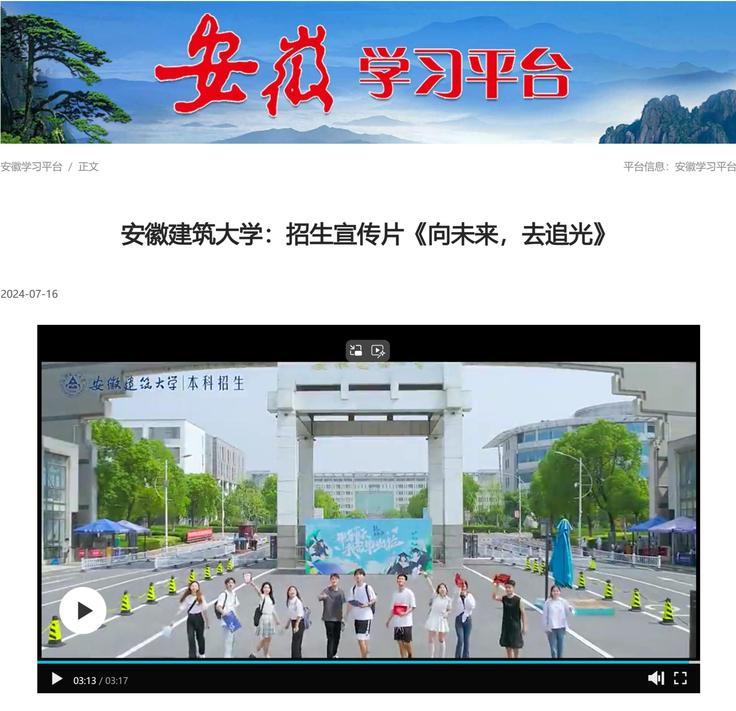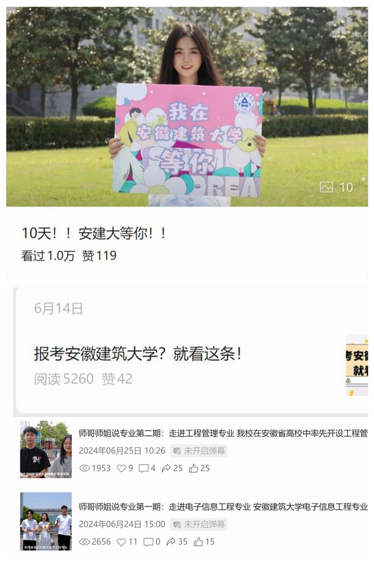 创新形式,打好新媒体矩阵“组合拳”。在集中招生宣传期间,党委宣传部联合招生办,充分利用学校官网官微、综合运用图文、视频等多样化呈现方式,制作、转发招生信息相关推文20余篇,其中《10天!安建大等你!!》推文阅读量破万;联合二级学院推出“师哥师姐说专业”系列新媒体作品,以在校学生视角向新生家长推介学校优质专业,增强专业宣传的传播吸引力;积极参与安徽日报“高校寻宝记”栏目,取得良好宣传效果。