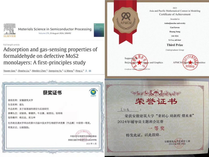 党支部不断创新工作方法,取得了突出成绩。支部持续开展数理“朋辈说”特色活动,学生党员们结合自身需求围绕“朋辈学业、创新创业、学科竞赛、文体活动”四个模块进行双向选择,帮扶对象由支部党员所在班级的学生,进一步辐射到全院学生。“朋辈说”系列活动,创造性发挥了学生党员在学风建设方面的榜样示范作用。支部以龚书磊、戚昊翔为代表的多名党员在“创新创业大赛”“数学建模竞赛”等各类学科比赛中,取得了全国大学生数学建模竞赛安徽赛区一等奖等荣誉。支部委员王影获得2022年度“ku游官方优秀共产党员”称号,支部书记吴钰濛在ku游官方2024年辅导员主题班会比赛中荣获一等奖,支部学生党员高娅雯以第一作者在国家学术期刊Materials Science in Semiconductor Processing(IF=4.1,JCR二区,中科院三区)发表题为“Adsorption and gas-sensing properties of formaldehyde on defective MoS2 monolayers: A first-principles study”的研究论文。