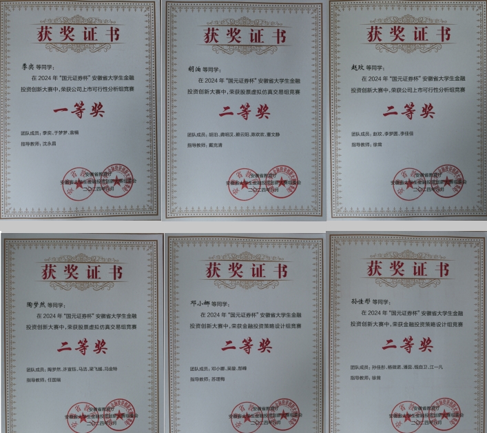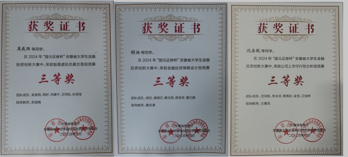 本网讯 近日,由安徽省教育厅主办、安徽财经大学承办的2024年安徽省大学生金融投资创新大赛落下帷幕。我校学子与来自安徽财经大学、安徽大学、合肥工业大学、安徽师范大学等省内高校的一千多个团队同台竞争,经过激烈角逐,季奕作为队长组建的团队获得省一等奖,胡泊、赵玟、陶梦然、邓小娜、孙佳彤作为队长组建的团队获得省二等奖,吴辰雨、胡泊、沈宗航作为队长组建的团队获得省三等奖。