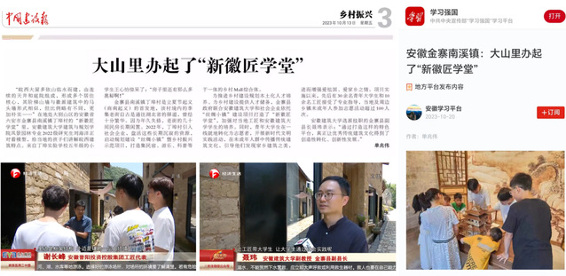 “新徽匠学堂”是由我校联合金寨县人民政府、安徽誉阳投资控股集团(校友企业)在金寨县南溪镇丁埠村共同成立的传统建筑文化传承基地。依托“新徽匠学堂”,传统工匠通过现场实操将传统建造技艺“师徒制”浸润建筑类大学生的“徽匠精神”;大学生将所学的理论知识和技艺传递于乡村儿童,以此推进文化传承和乡村美育。中国建设报、新华网、学习强国、安徽电视台等媒体多次做专题报道。