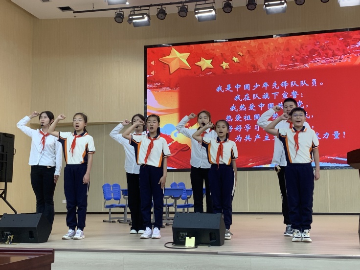 “出旗!”随着铿锵有力的出旗曲响起,鲜艳的中国少年先锋队队旗庄严入场。全体少先队员凝神注视着鲜艳的队旗,郑重地向队旗敬礼,大队辅导员宣读新队员名单后,老队员为新队员们佩戴红领巾。看着胸前飘扬的红领巾,每位新队员的脸上都洋溢着激动和自豪。这是他们期盼已久的时刻!戴上红领巾,就意味着多了一份沉甸甸的责任,一颗颗承载着美好理想的种子在他们心中悄然萌发。他们面对鲜艳的队旗,高举右手,铿锵有力地宣誓。那一刻,孩子们的眼神坚定,声音洪亮,这是他们内心深处对未来的承诺。