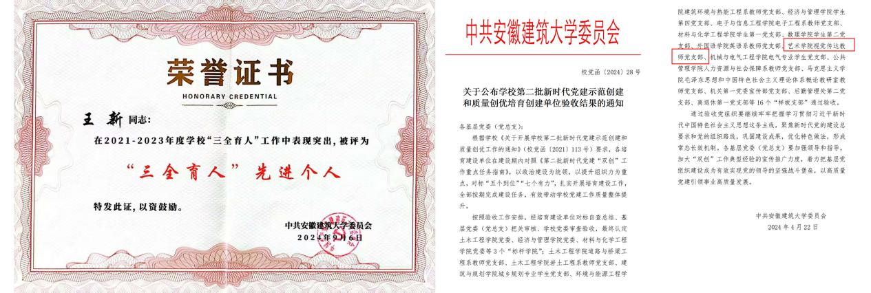 抓支部建设,强化组织引领。样板党支部建设成果显著,环设雕塑教师党支部获学校2024年度先进基层党组织称号;视觉传达教师党支部书记获学校“三全育人”先进个人称号,视觉传达教师党支部通过学校第二批新时代党建示范创建和质量创优培育创建单位验收、获得学校第三批全省高校“双带头人”教师党支部书记工作室推荐。国家一流专业动画专业1名党员教师获国家社科基金艺术学一般项目立项。