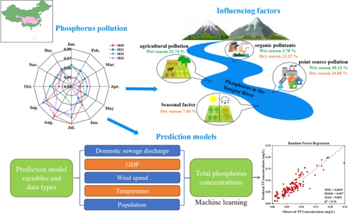 磷是水体富营养化的限制性指标,也是生物系统中不可或缺的营养物质。过量的磷会对鱼类和底栖生物群落造成负面影响,然而,在磷来源广泛、水文地质条件复杂的大流域,很难准确评价磷的主要来源。论文结合长江全流域的地质特征,采用APCS-MLR模型分季节确定磷的主要来源,并进一步使用机器学习方法预测其富集程度,结果表明,长江磷浓度在2020-2023四年内下降了9.15%,且磷的主要来源为点源污染(42.51%),其次是农业污染(32.74%)和有机污染物(8.46%),Random Forest模型在预测总磷浓度方面表现良好,R2值为0.76,本研究为长江及其他大流域磷污染管理和富营养化控制提供了新的思路。(作者:侯晓云 蔡格格;一审:侯晓云 二审:黄健;三审:谢发之)